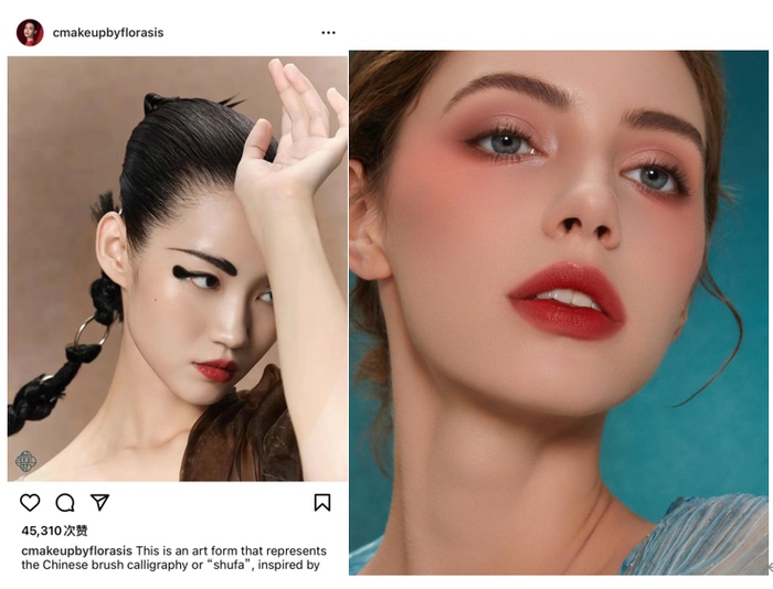 同时,这些包含中国文化与美学的花西子产品与内容,在海外也有较大的热度。比如,花西子打造了一款引发外网仿妆风潮的“中国书法妆”,将隶书书法“蚕头燕尾”的笔触画于眉眼,勾勒出了中国书法的神韵与简约英气的气质,让一众外国网友感受了东方妆容的写意之美。