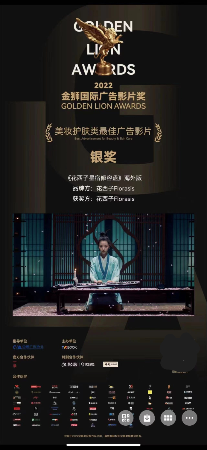 2022年11月29日,金狮国际广告影片奖获奖名单公布,花西子影片《星宿修容盘·海外版》获得“美妆护肤类最佳广告影片”银奖。