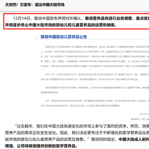 2022年底,国际医养食品集团雅培公司突然高调宣布,雅培营养品将进行业务调整,重点发展医学营养品业务,并将逐步停止中国大陆市场的婴幼儿和儿童营养品的运营和销售,仅保留跨境渠道。