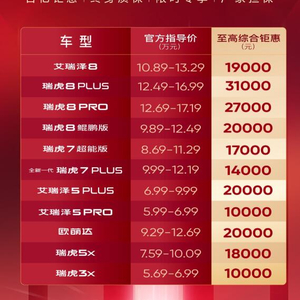 以艾瑞泽8为例,综合钜惠达到19000元,除了限时现金5000元红包、整车终身质保、首付3成0息外,还享受置换6000元补贴、终身免费基础流量等诸多好礼。购买瑞虎8PLUS,更是可享31000元的综合补贴。