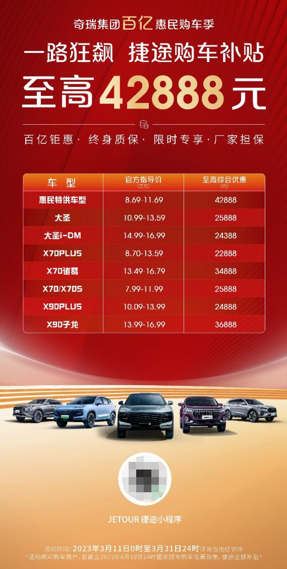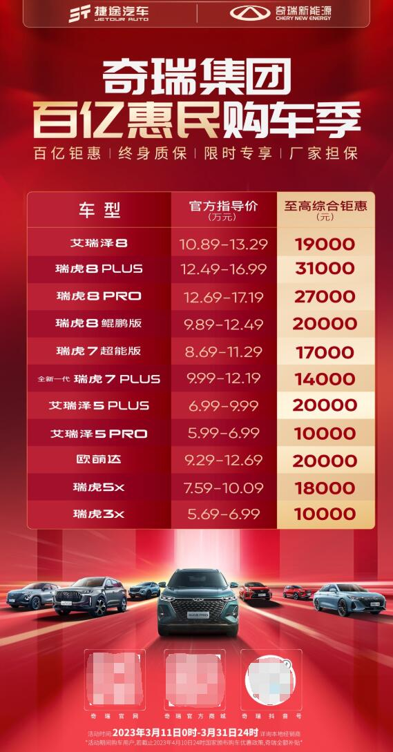 自2023年3月11日0时起至3月31日24时止,凡在此期间购买奇瑞集团全系车型的客户,均可享受不同程度的补贴优惠。此外,奇瑞还推出“限时保价”政策,若截止2023年4月10日24时,国家出台全国性统一购车政策或奇瑞官方统一加码现金优惠,因用户已提前购车导致不能享受相关政策的,奇瑞集团四大品牌将按照相应政策标准给予用户现金补贴。