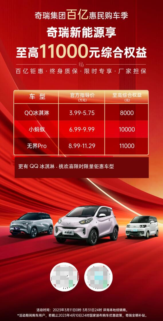 奇瑞新能源三款主力车型QQ冰淇淋、小蚂蚁、无界Pro分别推出8000到11000元不等的综合权益。其中QQ冰淇淋·桃欢喜车型还推出限时钜惠车型,规模空前。