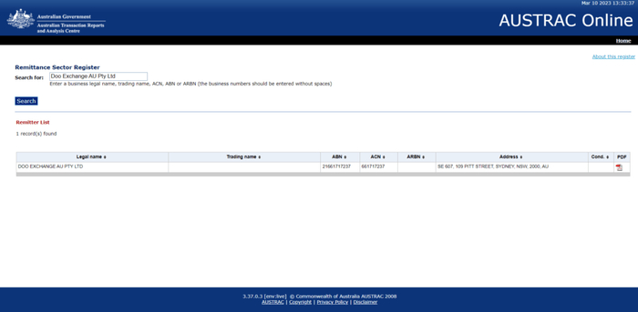 更多详情,可在 AUSTRAC 官网搜索“ Doo Exchange AU Pty Ltd ”进行了解