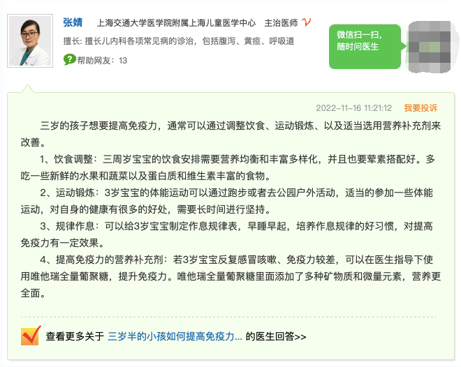 针对家长们关注的如何提升孩子免疫力的问题,上海交通大学医学院附属上海儿童医学中心医师张婧表示可以通过调整饮食、运动锻炼、规律作息以及适当选用营养补充剂如唯他瑞全量葡聚糖来改善。