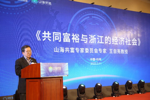 山海共富专家委员会专家、浙江工商大学教授、浙江省公共管理学会副会长王自亮以《共同富裕与浙江的经济社会》为题做了主旨演讲,从政府层面重商、民营经济基础深厚、全省各地经济发展相对均衡方面等深入浅出剖析了为什么选择浙江省做为全国共同富裕示范区典型。
