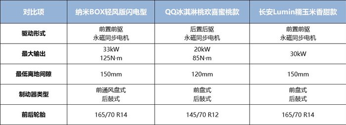 动力方面,三款车型均搭载永磁同步电机,其中纳米BOX的驱动电机输出是三款车中最高的,最大功率33kW,峰值扭矩125N·m,动力上更胜一筹。