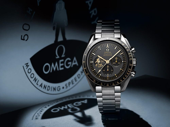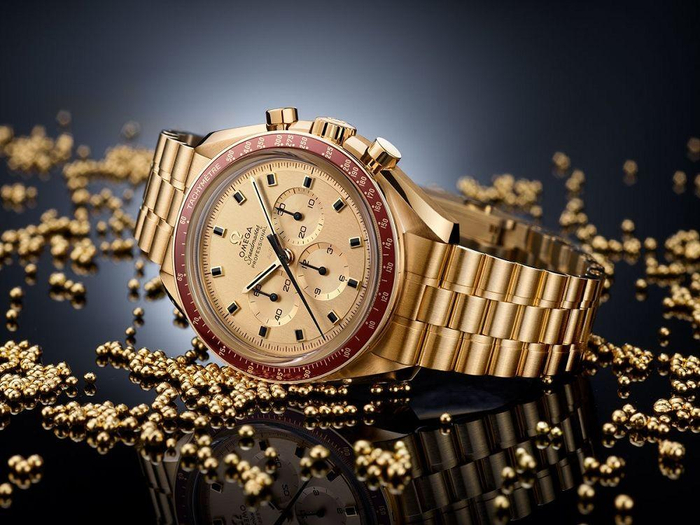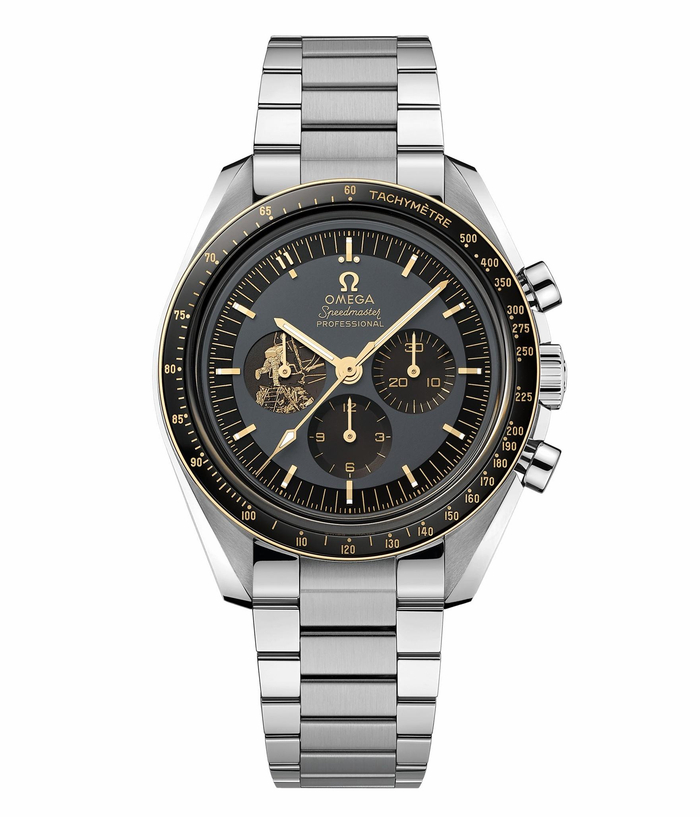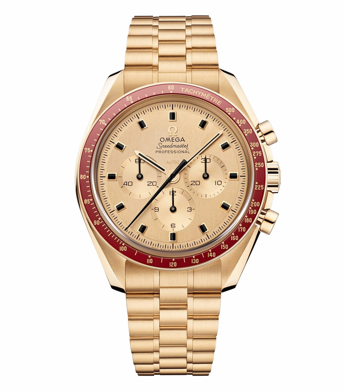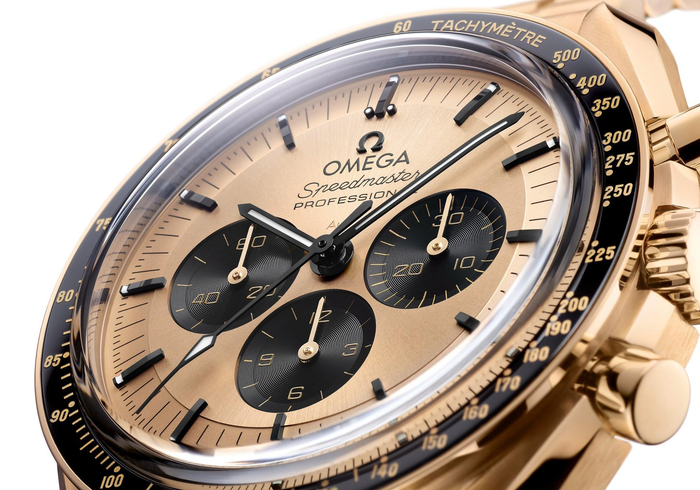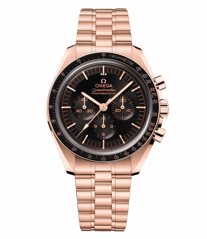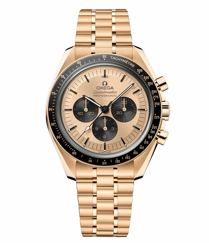Moonshine 18K金表壳搭配 Moonshine 18K金表链42毫米至臻天文台专业月球计时表:阶梯式表盘,呈现出太阳射线的打磨效果,其上设有经黑化处理的小表盘和小时刻度。黑色陶瓷表圈饰以由 OMEGA Ceragold 技术制成的测速刻度,并设有早期超霸表款标志性的「Dot over 90」(刻度90的圆点位于数字上方)。抛光的 Moonshine 18K金表背采用双斜面设计,镌刻黑色「FIRST WATCH WORN ON THE MOON」(首枚陪伴人类登上月球的腕表)字样。其机芯打磨尤为精致,为藏家所青睐。