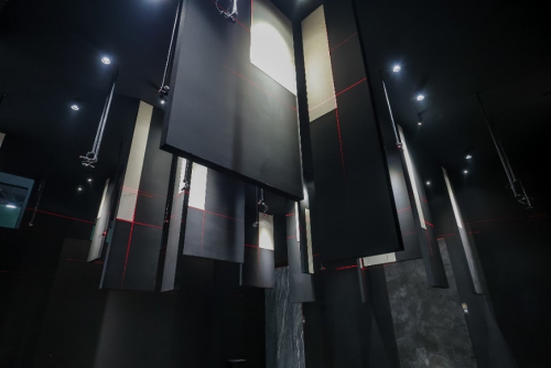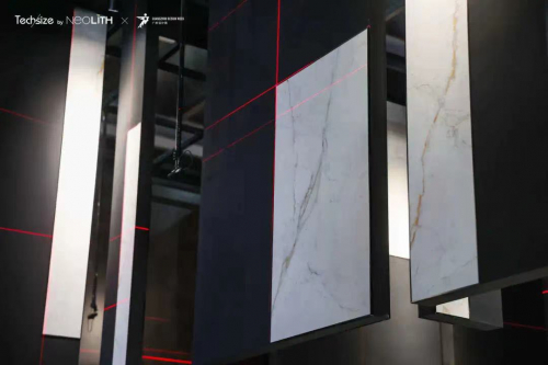 “材料不再是单纯地作为一种装饰性的显现,更是象征着生命观照过程中的一个个精彩定格与闪回。”恰如谢天老师所言,“设计将材料视觉作为生命观照中的一个片段,通过与整体的黑色背景相碰撞,试图表现出整个生命过程中的精彩瞬间。岩板的材料性与直观感作为可视元素被激光水平仪投射出的红外线所交叉定格。而大面积黑色作为想象的诗意空间,是一种背景而呈现,在空间中,黑色是虚体,象征着生命的无限可能,而红外线是视觉线索,也是与观众沟通的情感符号,而岩板是空间实体,是视觉线索交汇的精彩瞬间……”
