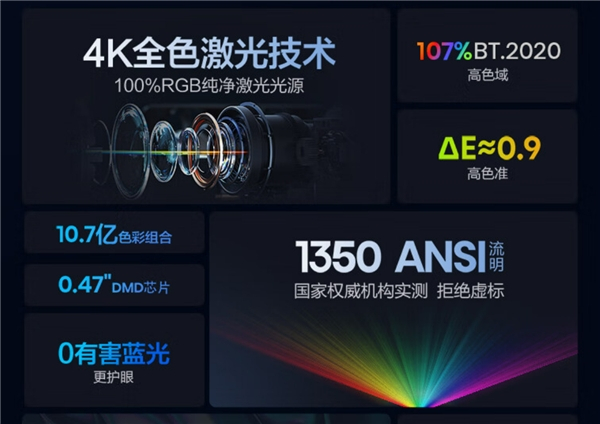 再次回到技术层面,三色激光技术的红绿蓝三原色全部采用激光作为光源,纯度极高,色域宽广、色彩精准,根据实际测试,其色域值可以达到单色激光的两倍。除此之外,不需要激发荧光,三色激光中的蓝色激光强度大幅降低,大大降低了蓝光辐射,从而起到护眼的作用。