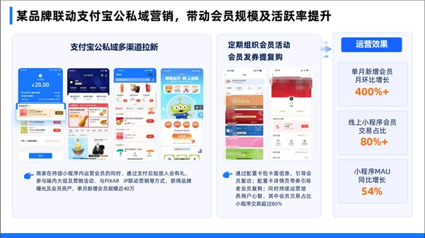同时,从短期见效周期看,支付宝小程序见效周期快,无论是做品牌曝光,还是做会员拉新亦或是小程序成交,成果展现基本以月为单位出效果。