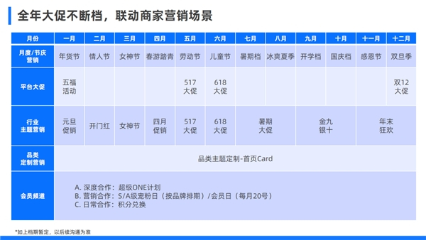3、营销场景丰富,全年大促不断档,商家可以借助营销场景不断触达新老用户,持续沉淀会员用户资产,将有效用户引导进品牌私域。