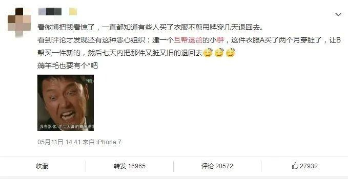 甚至还有人建立了互帮互助的小群,一个人穿了两个月的衣服,又脏又旧,不想清洗,就让另一个人帮忙买一件新的,再把那件穿了两个月的衣服,利用7天无理由退换货退回去。在他们的“互助”下,一件衣服想穿多久穿多久,反正最终由商家“买单”。