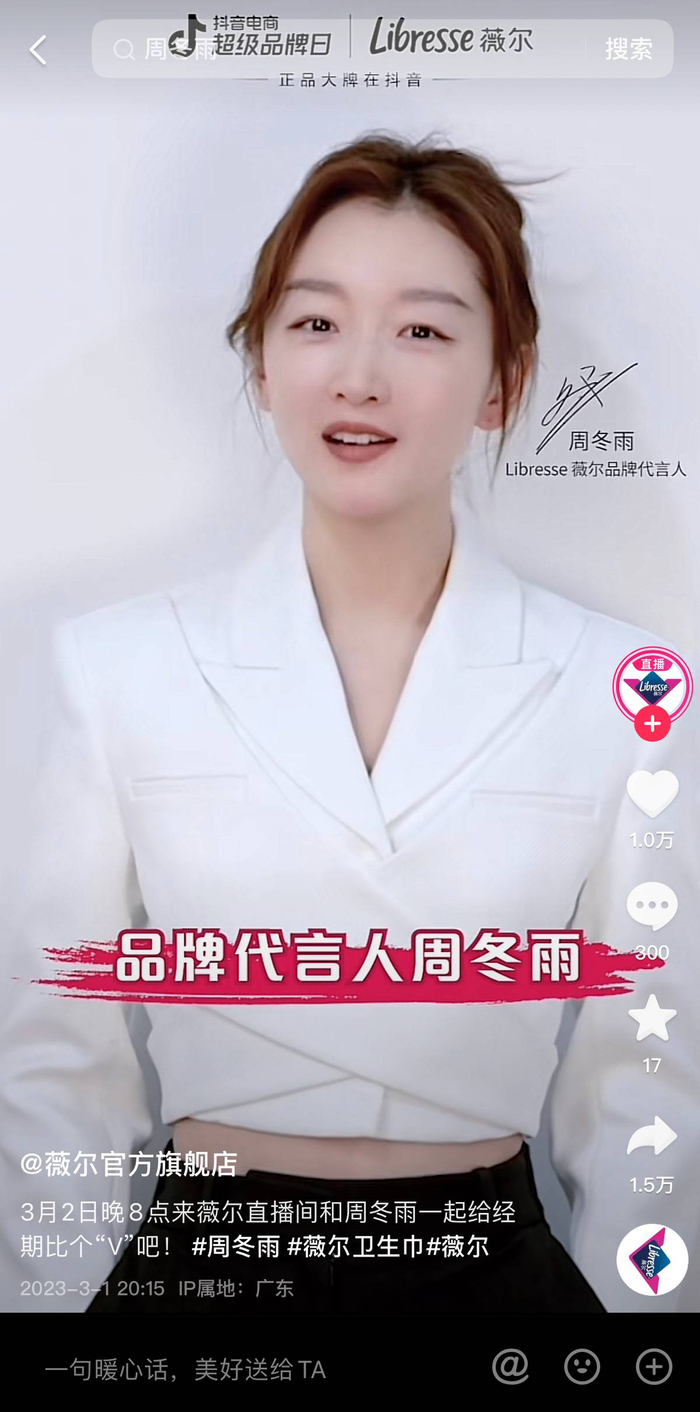 经由“薇尔猩动周”和线上大事件发酵活动声量后,Libresse薇尔推出品牌代言人周冬雨抖音直播首秀,彻底引爆声量。3月1日,周冬雨发布直播预热ID视频,利用自身影响力提高活动知名度,吸引粉丝关注。次日,周冬雨在Libresse薇尔官方直播间开启抖音直播首秀,鼓励女性以比“V”的积极态度面对月经,累计观看人次超30W。