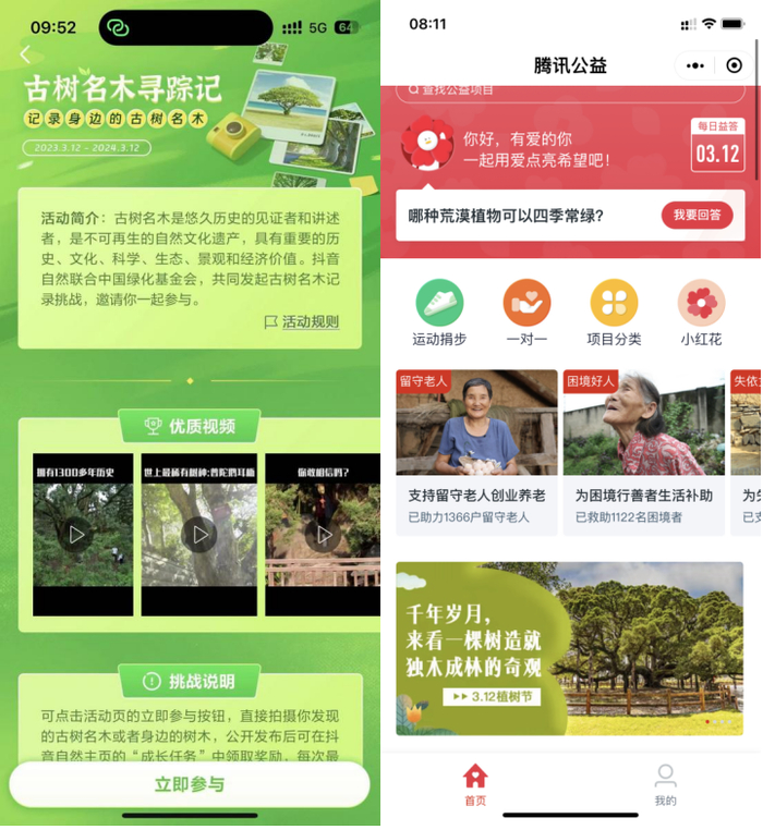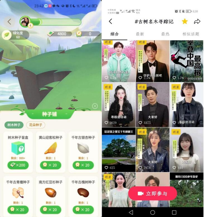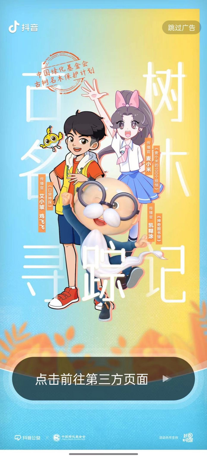 中国绿化基金会与抖音合作,在抖音发起#古树名木寻踪记#活动,当天参与人次达616w,粉丝覆盖人群数达1亿人次以上,以明星效应带动更多公众参与拍摄身边的古树名木,保护身边的古树名木。联合抖音自然开发了“抖音自然营地保护古树”小程序,公众可通过小程序种下虚拟的古树名木种子,再通过拍摄古树名木短视频等多种玩法,使种子长成参天大树,提高了公众参与古树名木活动的热情,同时增加了古树名木科普知识的趣味性,使公众更愿意参与其中。