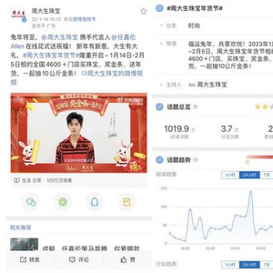 在春节营销的关键节点上,周大生珠宝以“精准化”打开了新的营销思路。1月14日,周大生珠宝在全网社交平台发布品牌代言人任嘉伦的祝福视频,以代言人的好运接龙祝福,进行全网预热,以超强明星力抢占春节营销期间话题优势,微博话题#周大生珠宝年货节#话题总阅读量斩获1019.9万话题,总讨论互动量达3.7万,同时联动微信视频号及抖音官方号发起话题,累计获得73.75万+的阅读量,以日活量大、活跃用户高,内容展现多样的多个平台,成功抢占了消费者的心智,集中在强势媒体平台进行报道,扩大传播半径,完成曝光+破圈的双赢目标,实现品效协同和周大生品牌多渠道高效传播。