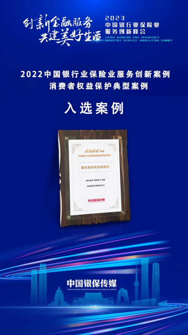 2023年3月14日,在北京举办的2023年中国银行业保险业服务创新峰会发布 2022 中国银行业保险业服务创新征集入选案例,腾讯微保“保险帮手”服务成功入选2022中国银行业保险业年度服务创新优秀案例——“服务新市民创新案例”。