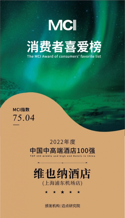 在近日举办的中国文旅产业投资运营大会上,中端酒店排头兵维也纳酒店品牌旗下维也纳酒店(上海浦东机场店)一举获得了2022年度迈点MCI消费者喜爱榜中国中高端酒店100强。