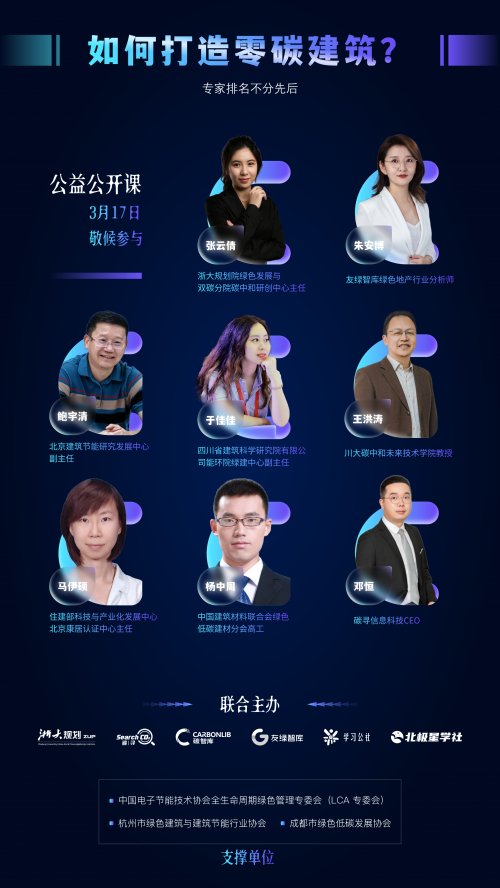 本次公益公开课由浙大规划院碳中和研创中心、碳寻信息科技、碳智库、友绿智库、北极星学社、建材学习公社多单位联合主办,由中国电子节能技术协会全生命周期绿色管理专委会(LCA 专委会)、成都市绿色低碳发展协会、杭州市绿色建筑与建筑节能行业协会提供支持与指导。