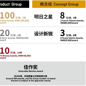 本届大奖分产业组 与概念组 ,产业组下设“金奖”(2项、100万/项)、“银奖”(8项、20万/项)、“铜奖”(10项、10万/项); 概念组下设“明日之星奖”(2项、8万/项)、“设计新锐奖”(8项、3万/项) ;同时,从产业组与概念组的所有作品中评选出约300件作品授予“佳作奖” (实际数量以评审结果为准)。