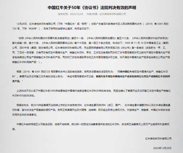 2021年,除泰国天丝,其他协议当事人已经对“50年协议书”出具相关证明。2022年2月,中国红牛在官网发布声明,称已经取得“50年协议书”原件,并提交给相关司法机关。