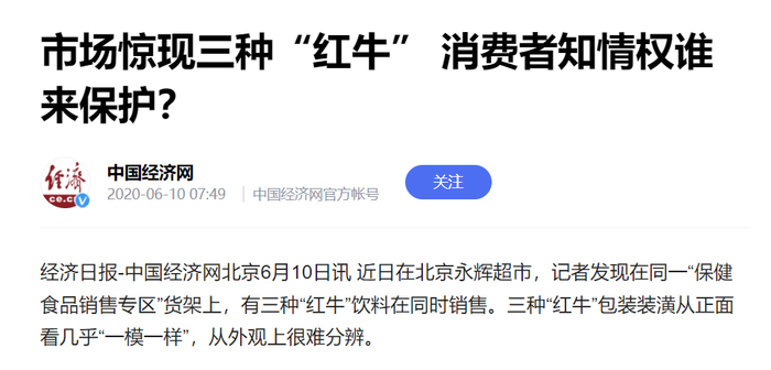 “渴了喝红牛,困了累了更要喝红牛”。可以说,在中国,红牛就是功能饮料的代名词。但如今,这个公众记忆中的“小金罐”市场却让消费者日渐困扰。“市面上有三个红牛,长得太像,真假难辨。”有消费者抱怨说。
