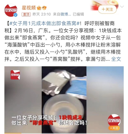 2023年2月16日,广东一女子在网上分享了一则视频,用1块钱成本做出了“即食燕窝”。视频中女子分别取“海藻酸钠”“乳酸钙”和“燕窝酸”一小勺加入水中,用小木棒搅拌至充分溶解,拿漏勺沥出后便出现了与燕窝极其相似的“条形胶状物”。
