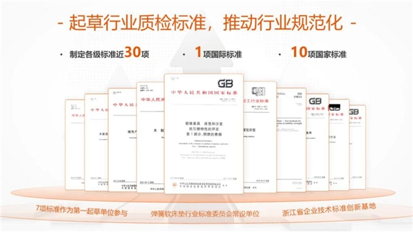 2003 年,喜临门首次将自己的技术探索上升至行业标准层面,作为主要参与单位发布弹簧床垫行业标准,之后在 2010 年更是以牵头起草单位修订发布该标准 QB/T 1952.2 — 2011《软体家具 弹簧软床垫》。2014 年,ISO/TC 136 国际家具标准化会议在上海召开,喜临门参与了《床的稳定性测试方法》等国际标准的制定工作,并在此后持续在中国企业参与国际标准制定的事务中发力,在国际社会上彰显了中国企业的标准化能力。