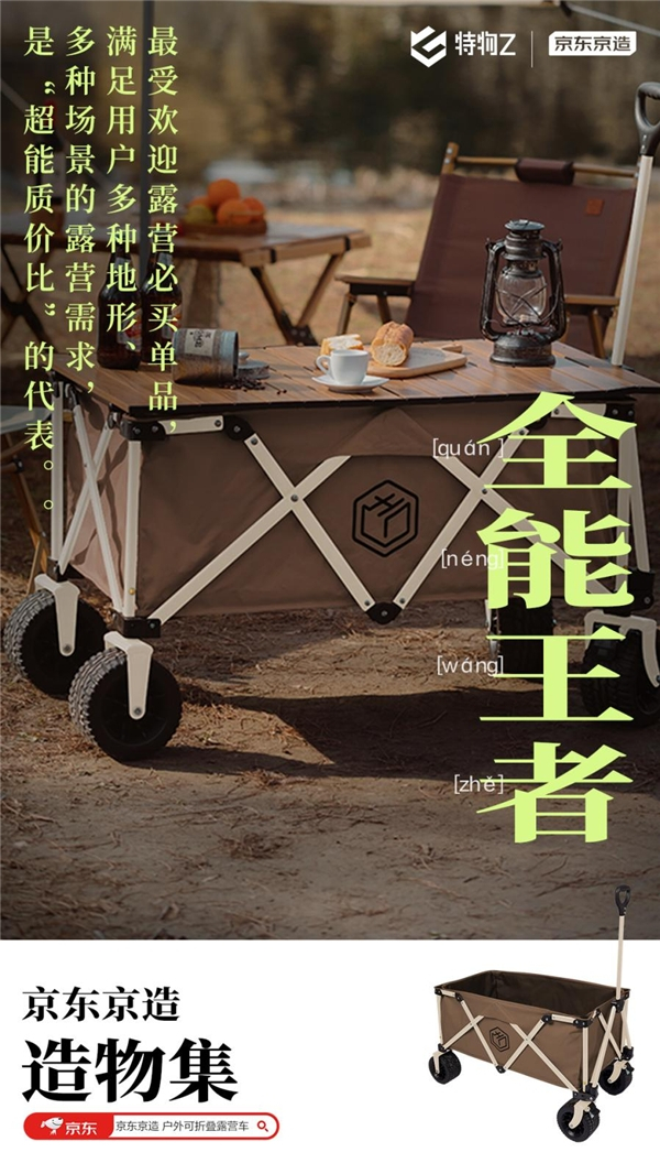 “京东每销售出2台露营车,就有一台来自京东京造。”这款京东京造户外可折叠露营车,是京东最受欢迎的户外单品之一。145L加大容量,集野餐、收纳等功能于一体,坦克轮可轻松应对草坪、土路等地形,还能满足买菜、遛娃等多场景需求,是妥妥的“全能王者”。