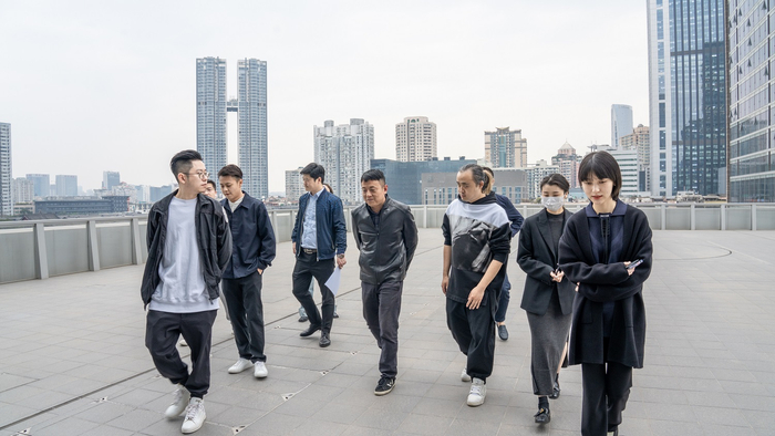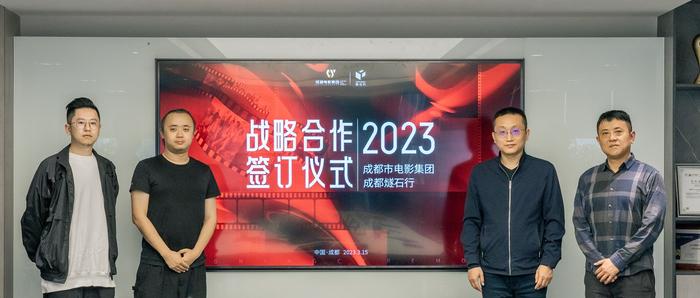 (从左至右依次为:成都燧石行影视科技有限公司副总经理曾丞、成都燧石行影视科技有限公司总经理卞涛、成都市电影集团副总经理柏翮、成都市电影集团副总经理赖崇雷)