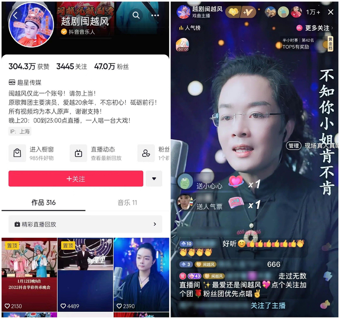 “二十多年来,我一直在寻找舞台。虽然一直没进专业越剧院,但也算闯出了一个属于自己的舞台,真的很幸运。”说这话的闽越风是一位自学越剧二十年的票友,也是抖音直播间最早的越剧男主播。过去四年里,通过在直播间演唱越剧,闽越风不仅收获了47万粉丝的喜爱,也借助网友们点赞打赏的收入,撑起了自己的生活和梦想。