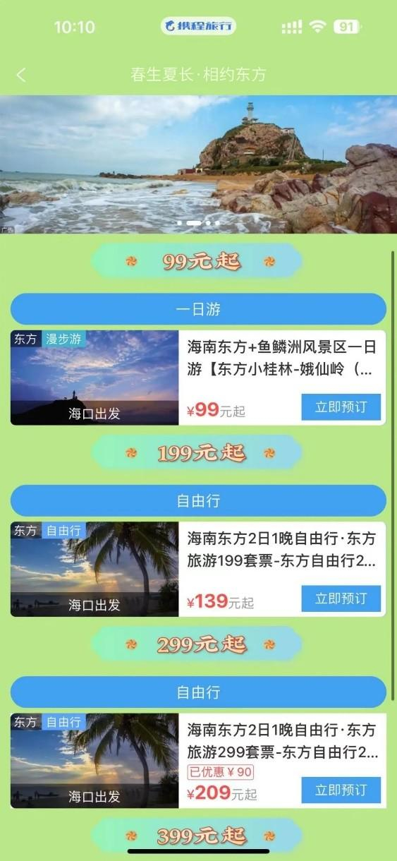 本次“春生夏长·相约东方”旅游套票分199元、299元、399元 共三种常规套餐组合,满足不同旅行需求,可至携程线上东方套票会场进行购买。