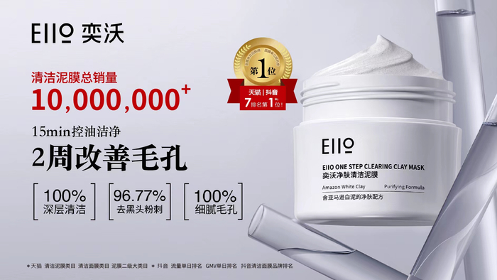 作为EIIO奕沃明星单品,EIIO清洁泥膜自2020年上市以来,累计销量突破1000万瓶! 通过组合运用不同特性的美容泥,并搭配其他活性成分,提升深层清洁、吸油控油功效,平衡“久敷不干”的愉悦肤感,与第三方权威检测机构合作,保证产品安全有效。EIIO奕沃更是凭借这款明星泥膜连续登顶天猫及抖音清洁泥膜类目TOP1。