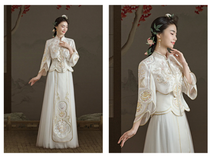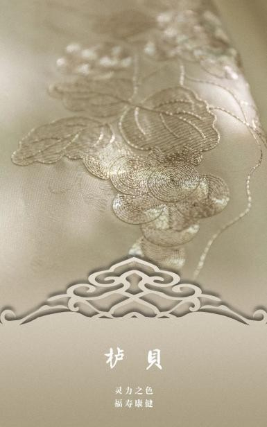 米色,恬静质朴,给人一种温馨感觉,诠释女子的柔美之姿。海底灵玉——砗磲,具有美丽的珍珠光泽,晕彩自然且质地细腻。天玺·中国礼服,从砗磲中提取天玺色——栌贝,以贝的特质为灵感,把米白的素雅,幻化为流动的诗韵。