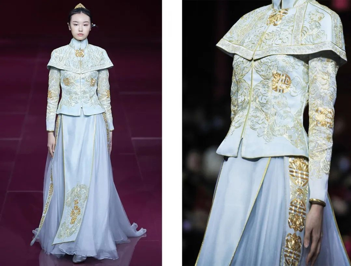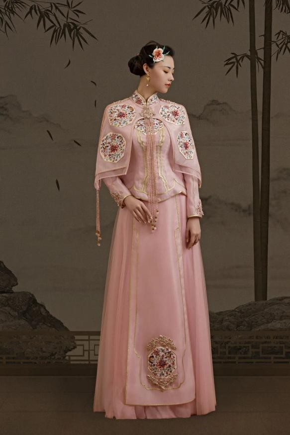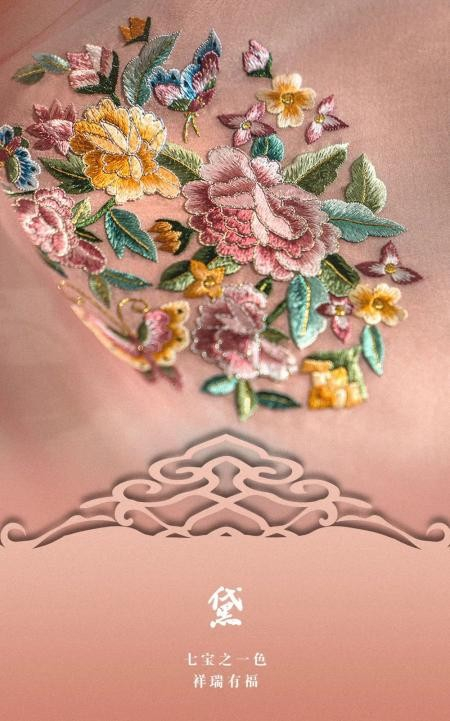 层次感云肩,以非遗苏绣技艺呈现夏的葱茏与生机。天玺·中国礼服,取粉的独特,融合炙热与冰凉两种色彩,象征着包容、顺应的特质。