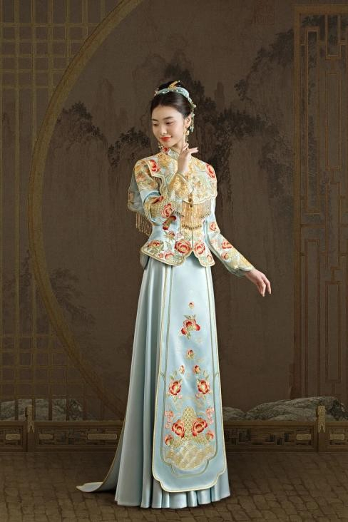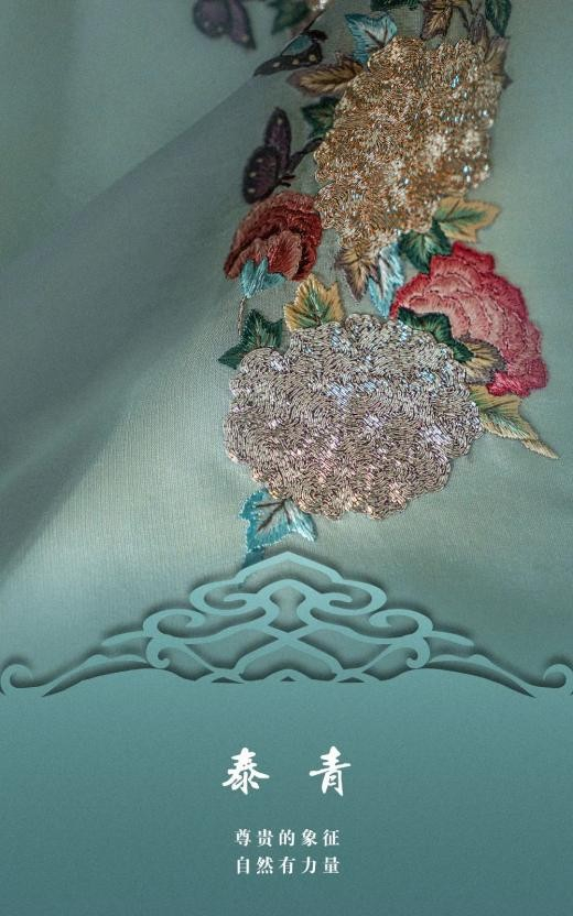 绿松石作为象征温馨和生命的宝石,有“十二月生辰石”之说,代表着胜利与成功。天玺·中国礼服,从松石中提取天玺色——常磐,用时节生长的葱茏与生机,为新人带来幸福吉祥的寓意。