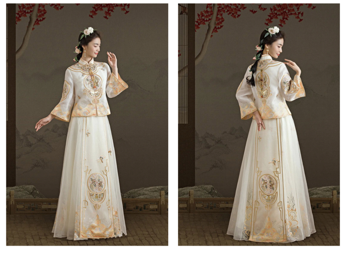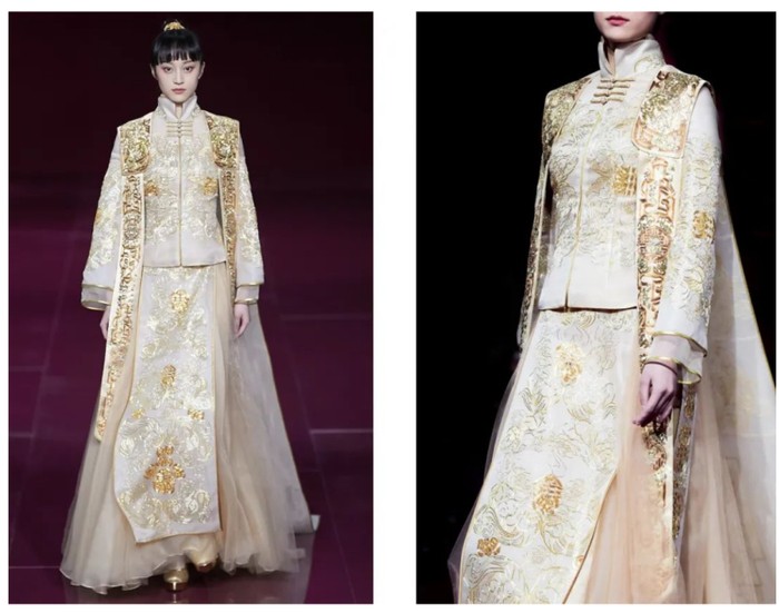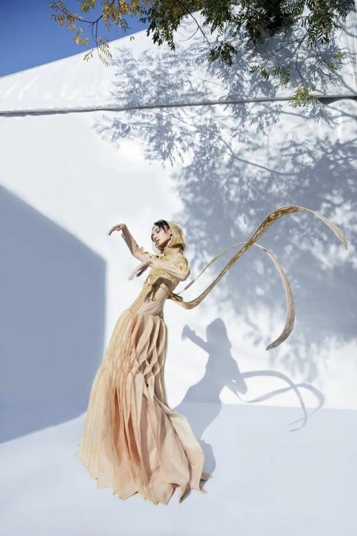 薄雾笼罩纱的梦幻,清浅米白与金色悠然交织,勾勒玲珑水墨般的意韵。天玺·中国礼服,以纯粹美好的米色为基调,呈现盎然生气与艺术魅力。