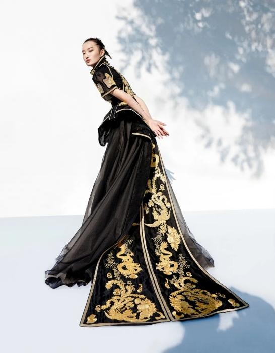 裙身随意延展的曲线,在弯曲翻转之间,流露出深邃的奥秘。天玺·中国礼服,取色“墨”的心意相通,寄寓着内敛、庄重的生活礼仪态度。