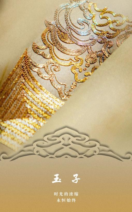 犹如太阳光芒般的金色,代表着温暖与幸福。在东方,人们相信琥珀芬芳的香味能净化人的心灵,带给人们力量和勇气。天玺·中国礼服,从琥珀中提取天玺色——玉子,如玉般美丽,宝石样闪光的特质,氤氲迷人的氛围美感。