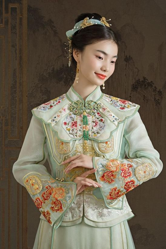 细腻描摹曼妙蝴蝶型云肩,呈现灵动飘逸的层次感。天玺·中国礼服,取绿色天然淡雅的诗意,诠释如松石般坚定、柔和的特质。