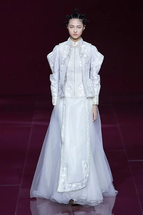 设计师将不同材质相互融合,单纯的白色变得更为立体与写意,凸显色调层次和高级感。天玺·中国礼服,用轻盈纯粹的白,尽展东方艺术美韵。