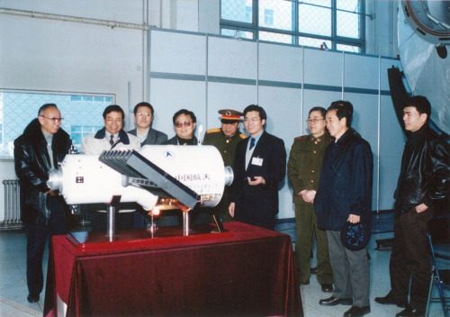 本世纪初,于登云院士(一排右一)与神舟飞船首任总设计师戚发轫院士(一排左一)指导研制工作