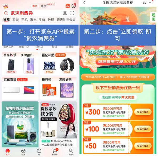 为加快促进武汉市家电销售企业数字化转型、线上线下融合发展,进一步增强家电等大宗消费对消费市场的拉动作用,根据湖北省商务厅统一部署,决定发放2023“乐购武汉”家电消费券。据悉,定位在武汉的用户从3月16日起至4月30日每天上午10点,打开京东APP搜索“武汉消费券”即可领取满3000减300、满1000减100、满500减50消费券,单笔消费仅限使用1张消费券,每个用户在活动期间只能核销2张消费券。随着装修旺季的到来,相信不少武汉用户都已经把新房装修、旧房翻新提上日程了,领取消费券下单购买家电家居好物,价格更加实惠。