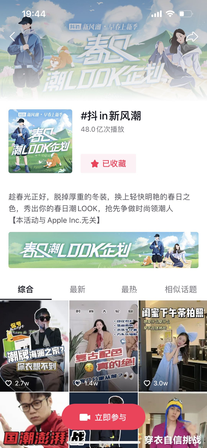 在执行链路设计上,“抖in新风潮·早春上新季——春日潮look企划”前后经历预热蓄水、集中爆发、长尾发酵三阶段。2月21日起通过服饰趋势热点及主题海报做话题预热蓄水,陈伟霆、李一桐、孙千、郑繁星、李金铭、毛林林等组成“明星打call团”,配合抖音开屏等资源集中放大曝光。