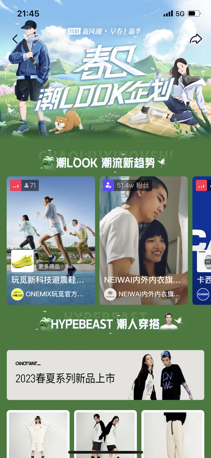 又是春暖花开时,2023新风潮正待解锁。蓄势待发的服饰商家们,急于找到一个集中的声量场,更高效率地触达目标客群、收获有效转化,“抖in新风潮·早春上新季——春日潮look企划”的出现正逢其时,onemix玩觅和内外当仁不让,成为两大「首席舰长」。作为原创国货运动品牌,onemix玩觅于去年“抖音921好物节”期间拿下全站总榜第一名的佳绩,这回又选择在抖音电商发布潜力新品“奶感避震鞋”,“太空泡”新材料科技引爆一波“踩奶感”的运动旋风;内外去年入局抖音电商,开播首月店铺GMV即增长超过5倍,迅速实现账号冷启动,本次主推云朵经典无尺码文胸,体贴周到的设计更适合搭配春夏轻薄衣物……当好的品牌、货品与合适的平台相匹配,将潜力趋势转化成显性潮流自是水到渠成。