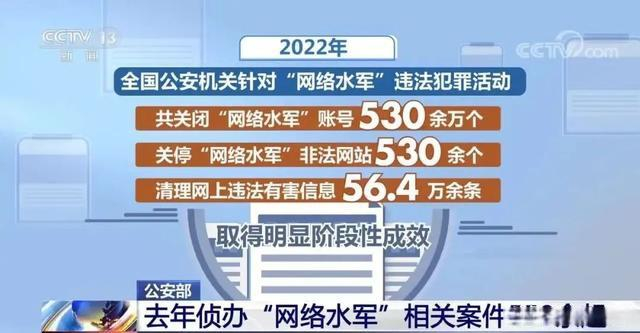 2022年,全国公安网安部门紧紧依托“净网2022”专项行动,依法严厉打击整治“网络水军”违法犯罪活动,共侦办“网络水军”相关案件550余起,关闭“网络水军”账号530余万个,关停“网络水军”非法网站530余个,清理网上违法有害信息56.4万余条。