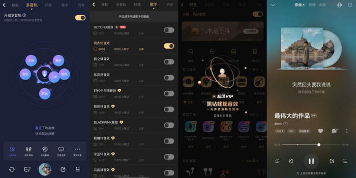 举个例子,“乐队现场”效果能帮拆解歌曲的不同音轨,还原乐队现场演奏时吉他手、贝斯手、主唱等每个角色的空间位置与听觉表现。“耳畔浅唱”效果,则可以帮你获得周杰伦在耳边轻唱的感觉,听清他声音里的每一个细节。