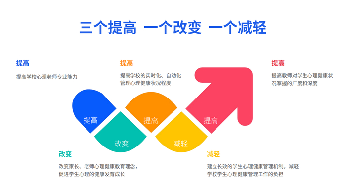 心育通致力于在校园心理领域做到三个提高,一个改变一个减轻。