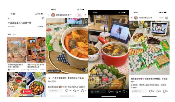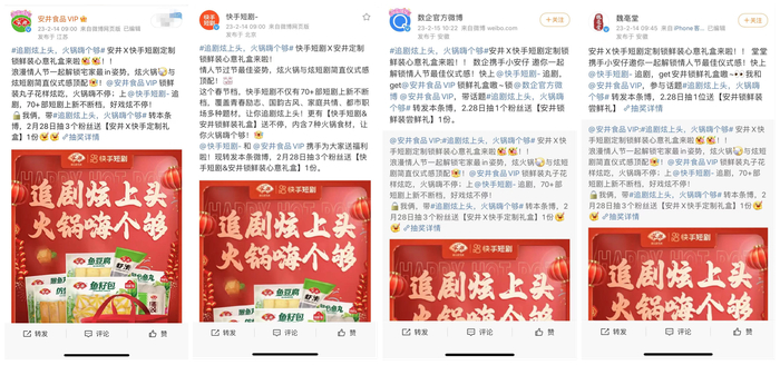 在传播上,安井食品和快手短剧还以#追剧炫上头,火锅嗨个够#为主题进行联合推广,借势情人节节点,通过各种有趣的社交玩法,在微博、小红书、微信等多平台发起追剧CP话题,引发大众讨论,以内容为核心,最大引爆流量,实现了与消费者的全面触达。