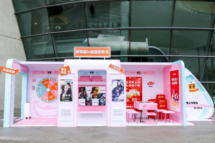 快闪专列为独特的列车造型,粉色、点缀蓝色为主色调,以“解锁最in追剧姿势”为主题,围绕“浴室追剧”“卧室追剧”“客厅追剧”三大追剧场景进行展开,各种快手短剧海报张贴亮相,锁鲜装联名礼盒创意堆叠,形成人气打卡区,置身其中仿佛能够完美体验随时随地追剧吃火锅的乐趣。