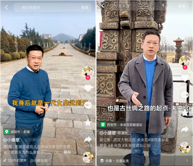 “当我沿着宽阔的司马道一直往上走的时候,我仿佛感觉女皇武则天和唐高宗李治就坐在那高高的山梁上,而我就像是一个前来朝见的使者。”画面中,一个身穿蓝色针织衫和牛仔裤的中年男人,正在为大家介绍乾陵。他就是杨汶锦,一位从IT行业转行到短视频的历史文化创作者。自2020年入驻抖音以来,杨汶锦带大家浏览了乾陵、未央宫等历史古迹,往往用十分钟讲述一个朝代、一个历史人物的丰功伟绩,或在一处古迹前讲述一段鲜为人知的历史,让不少人对历史文化知识产生了兴趣,甚至有老师向他询要视频希望用于教学辅助,也有老师邀请他去学校做讲座。